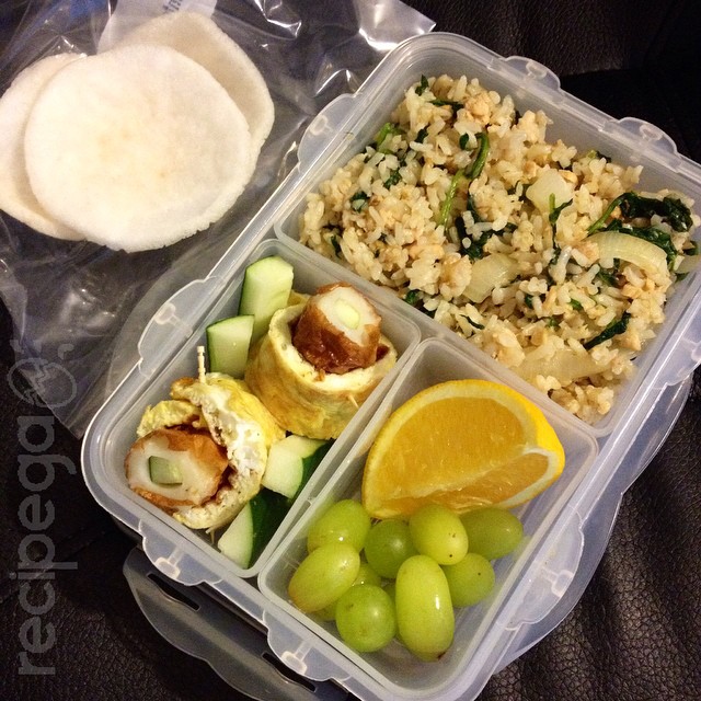 #bentotooffice today (8/5) : simply #friedrice with #cannedsalmon and spinach, ‘exclusive’ #chikuwa stuffed with #cucumber, and still.. #navelorange plus #grapes 🙂 😋 #recipega Posted by @egadioniputri via Instagram