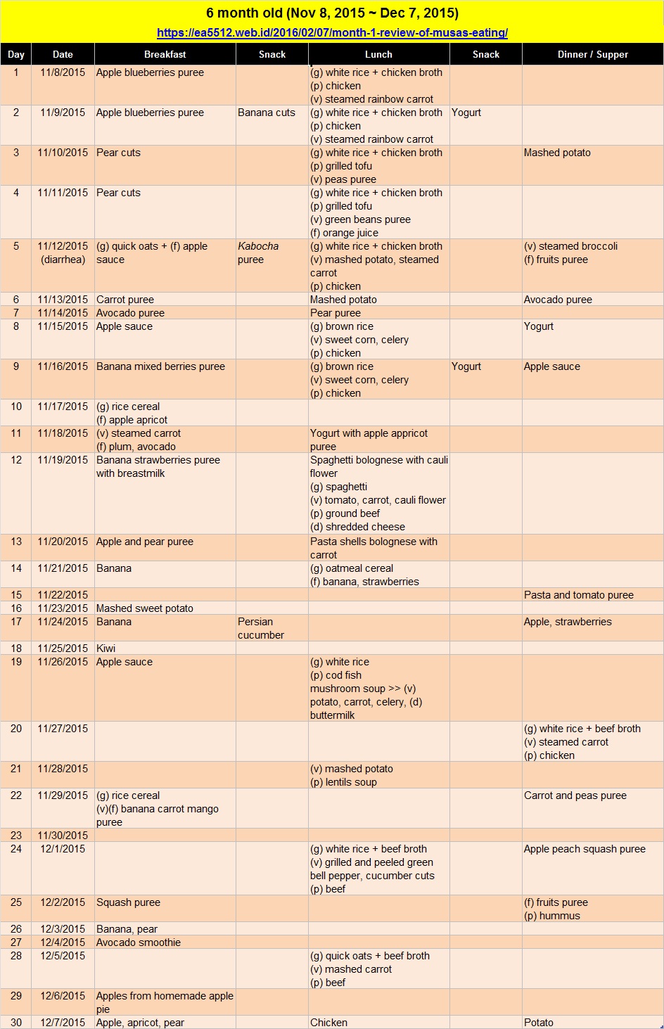 Besides the food summary, I also include a table containing meals of the month. Since I don’t make meal plan for Musa’s baby food (err.. I meant, I ‘write’ it in my head :D), the list helps me to trace what I’ve given to the baby from nutrition viewpoint.