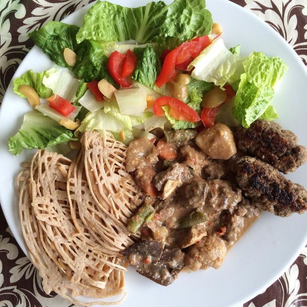 Fill half of your plate with veggies, #USDA recommends. Roti jala #rotijala + kari kambing #karekambing #karikambing #lambcurry + #kofta + #salad — Yesterday’s lunch menu from #recipega kitchen (3/7). Yum!Posted by @egadioniputri via Instagram