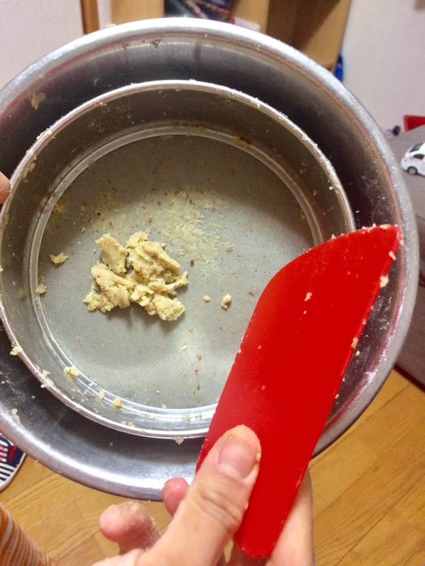 At the beginning my progress in sifting was very slow, then I figured out that holding spatula blade horizontally and press the puree using the edges instead of its tip could speed the process because it gave more pressure.