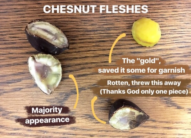 I was a little confused to see the chesnut fleshes were mostly yellow because I expected it to be reddish brown to put in the cake as seen in the images. Totally amateur, huh?