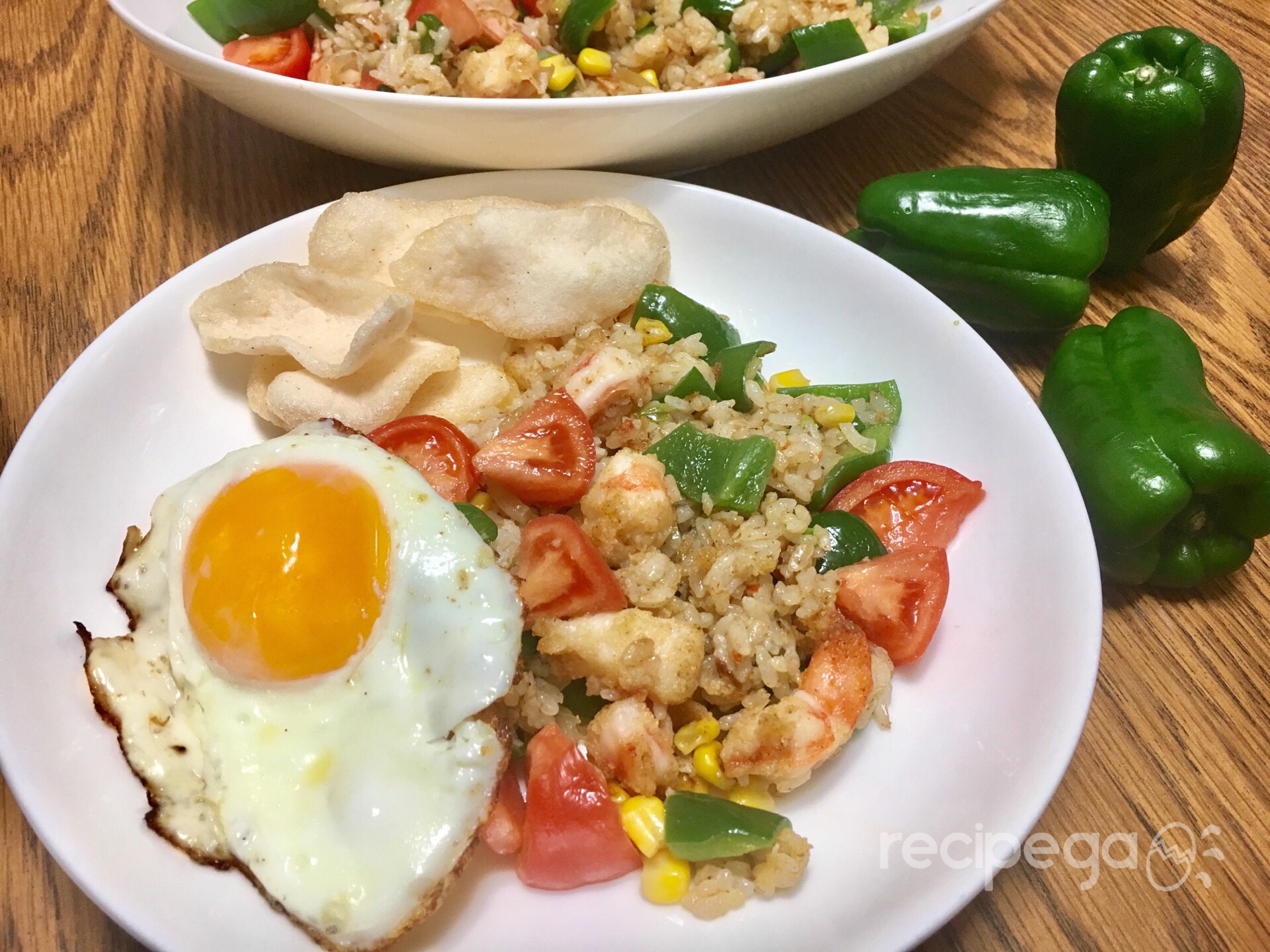 (3) Add the veggies (sweet corn, piman a.k.a. pepper), and shrimp. Cover with the lid or just turn over several times until the veggies and shrimp are well cooked, but the piman should be still crunchy.